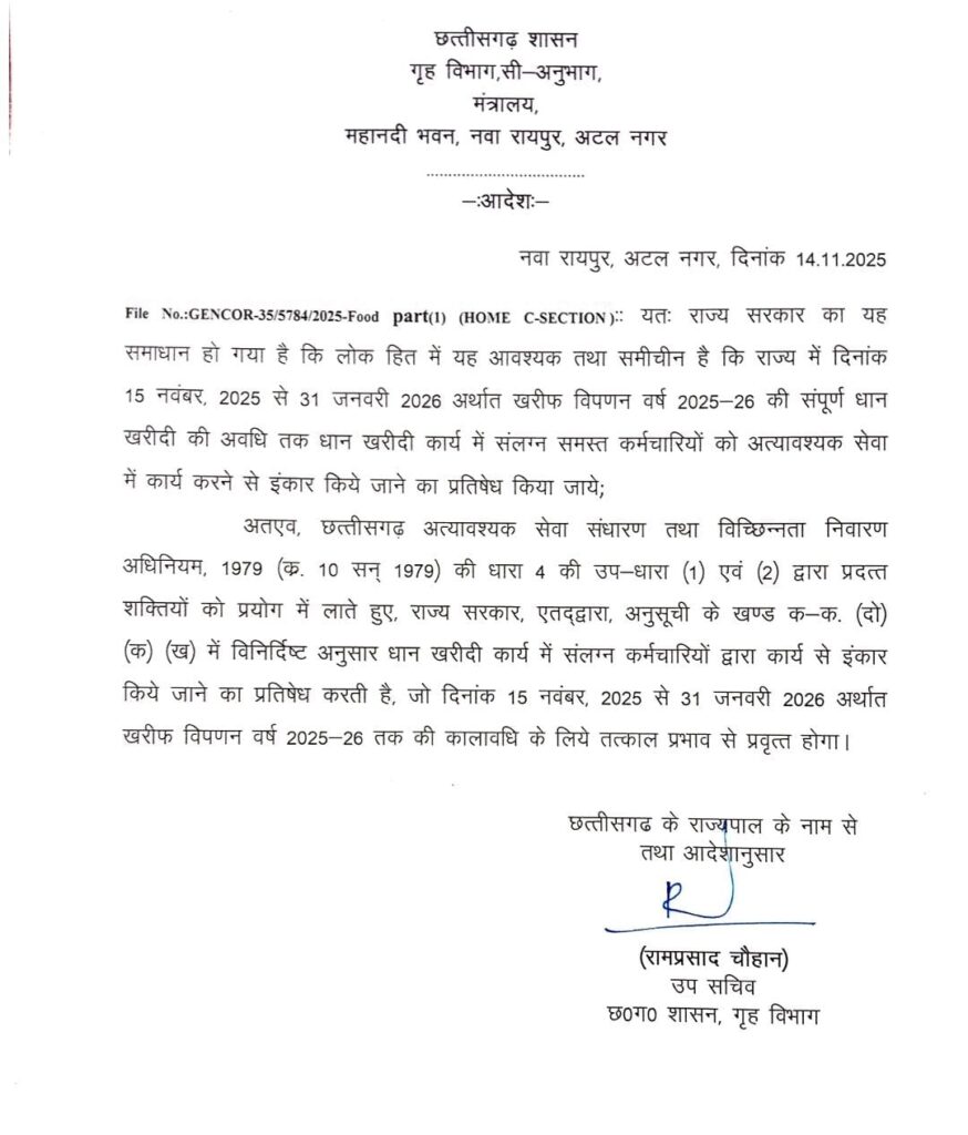 गृह विभाग द्वारा जारी आदेश में स्पष्ट कहा गया है कि धान खरीदी अवधि के दौरान किसी भी प्रकार की हड़ताल पूरी तरह प्रतिबंधित रहेगी। जो भी कर्मचारी खरीदी कार्य से इंकार करेंगे, उन पर सख्त कार्रवाई की जाएगी।