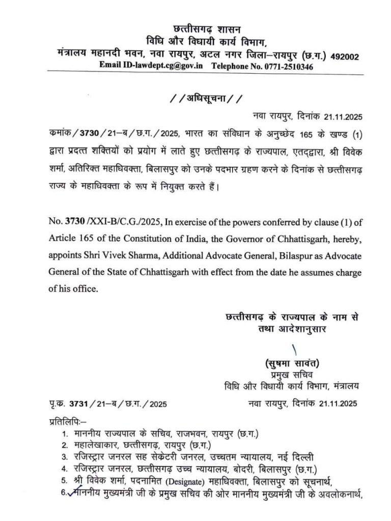 राज्य सरकार द्वारा जारी आदेश के बाद अब विवेक शर्मा आधिकारिक रूप से छत्तीसगढ़ के नए महाधिवक्ता के रूप में कार्यभार संभालेंगे।