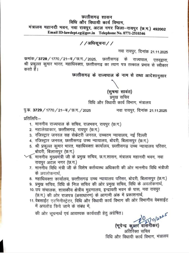अपने इस्तीफा पत्र में प्रफुल्ल भारत ने मुख्यमंत्री विष्णु देव साय, मंत्रिमंडल, नौकरशाही टीम, हाईकोर्ट और सुप्रीम कोर्ट के सहयोगियों के प्रति आभार प्रकट किया। उन्होंने कहा कि संवैधानिक कर्तव्यों का निर्वहन करते हुए उन्हें पूर्ण सहयोग प्राप्त हुआ और राज्य के प्रथम विधि अधिकारी के रूप में कार्य करना उनके लिए सम्मान की बात रही।
