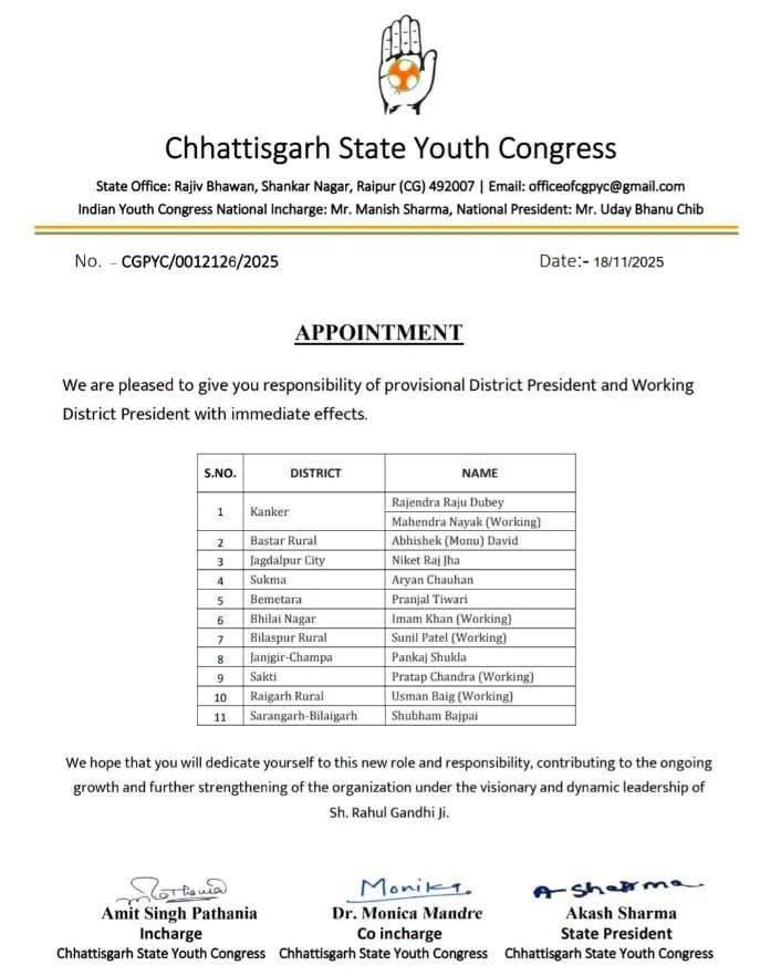 CG Congress: युवा कांग्रेस में 11 जिला अध्यक्षों की नियुक्ति, देखें पूरी लिस्ट