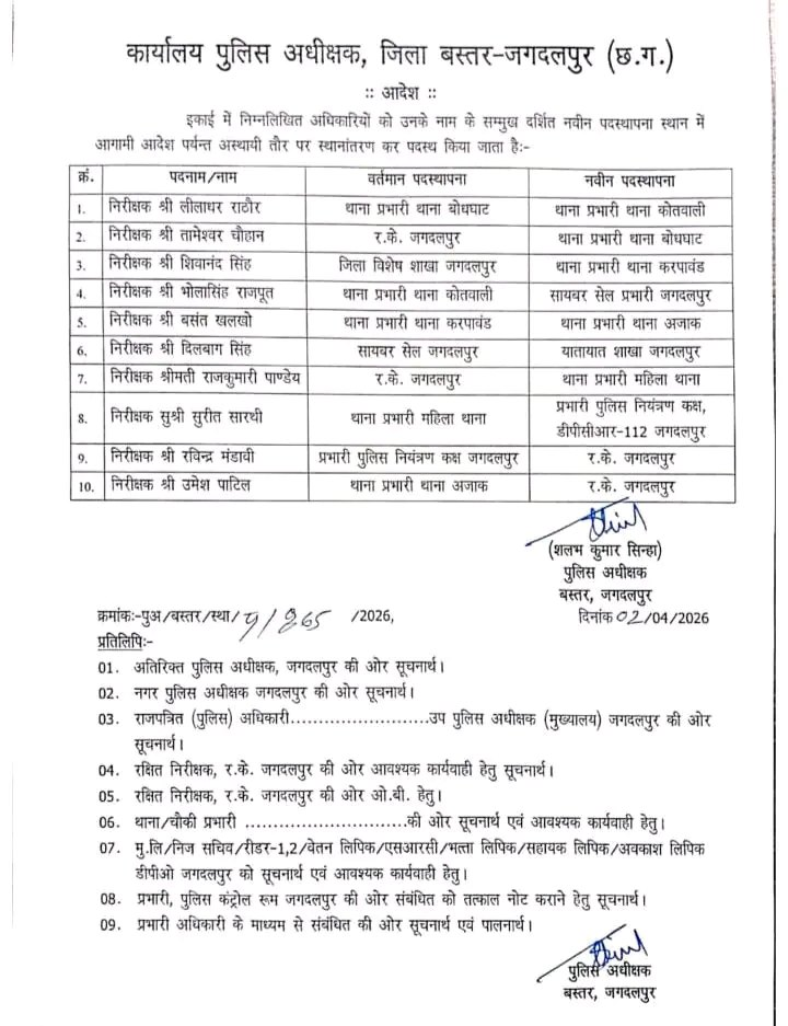 वहीं निरीक्षक रविंद्र मंडावी और उमेश पाटील को लाइन अटैच किया गया है। इस बड़े फेरबदल का उद्देश्य जिले में कानून-व्यवस्था को और अधिक मजबूत बनाना बताया जा रहा है।