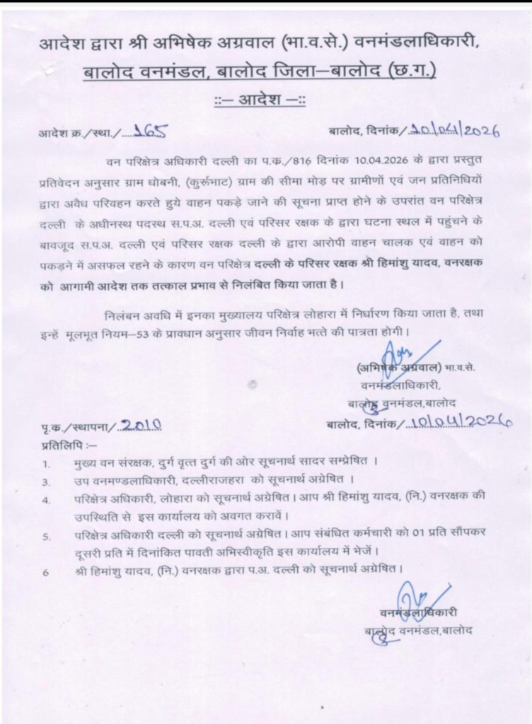 CG Suspend News: छत्तीसगढ़ में वन विभाग की कार्यप्रणाली पर सवाल उठाने वाला एक मामला सामने आया है। अवैध लकड़ी परिवहन के खिलाफ कार्रवाई नहीं करने पर सख्त कदम उठाते हुए डीएफओ अभिषेक अग्रवाल ने वन रक्षक हिमांशु यादव को निलंबित कर दिया है।
