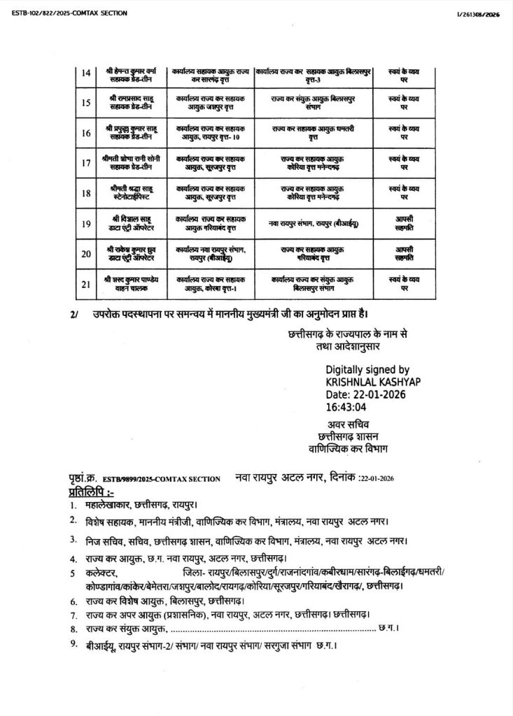 CG Transfer Breaking: वाणिज्यिक कर विभाग में बड़ा फेरबदल, 21 कर्मचारियों के तबादले, आदेश जारी