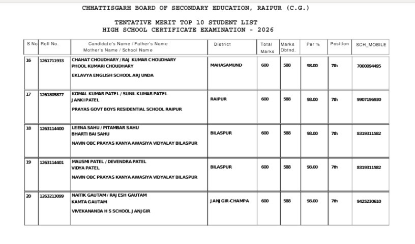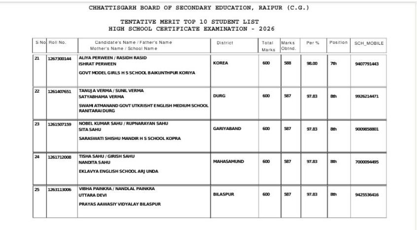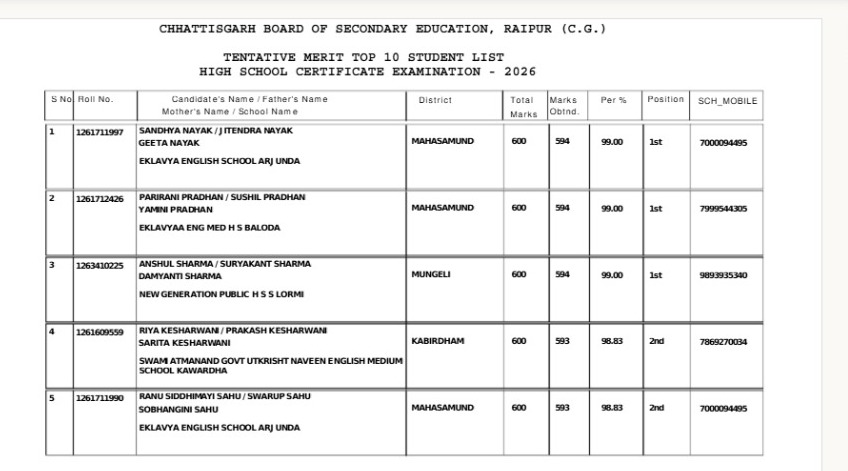 - संध्या नायक – एकलव्य इंग्लिश स्कूल, अर्जुंदा (594 अंक, 99%)