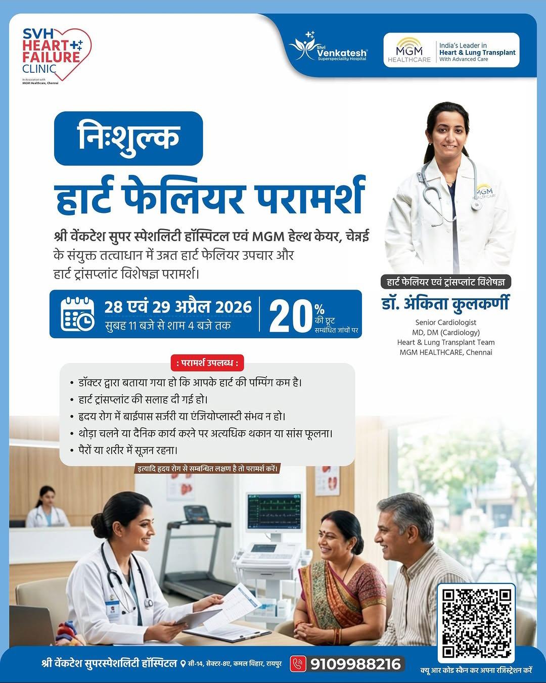 Heart Failure Camp: छत्तीसगढ़ की राजधानी रायपुर में हृदय रोग से पीड़ित मरीजों के लिए एक बड़ी राहत भरी खबर सामने आई है। श्री वेंकटेश सुपरस्पेशलिटी हॉस्पिटल और MGM Healthcare के संयुक्त तत्वावधान में 28 और 29 अप्रैल 2026 को निःशुल्क हार्ट फेलियर परामर्श शिविर का आयोजन किया जा रहा है।